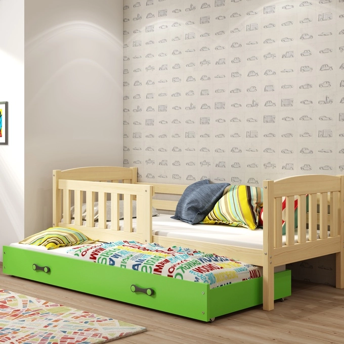 Ausziehbett für Jugendliche Jakob, 90x190, mit Matratze und Schublade, Kiefer/grün