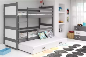Etagenbett für drei Personen Richard, 90x190, mit Matratze und Schublade, grau/weiß