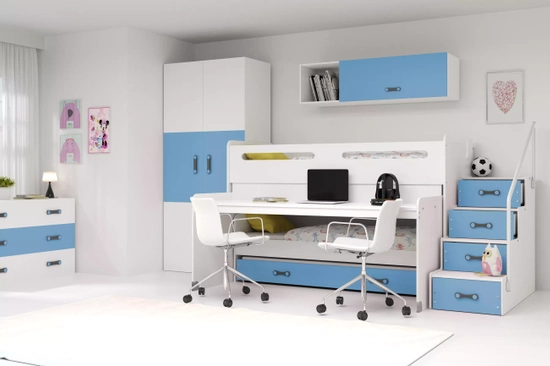 Hochbett für drei Personen Max 1, 80x200, mit Matratze und Schreibtisch, blau