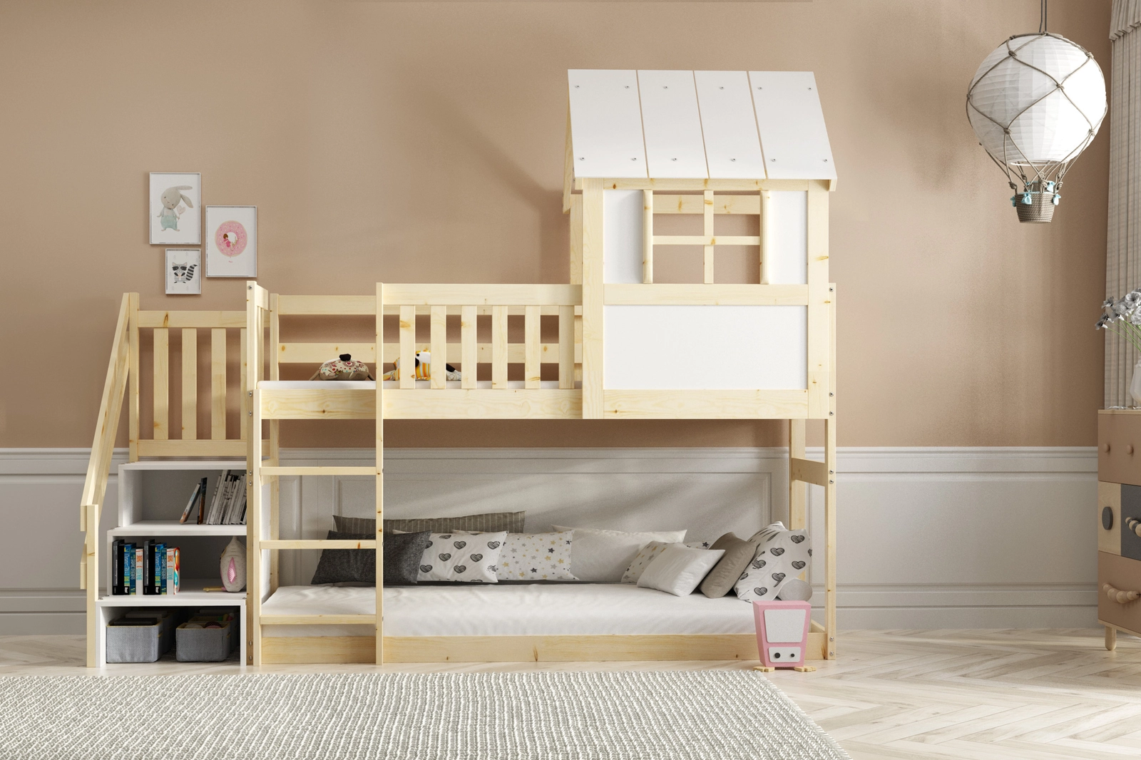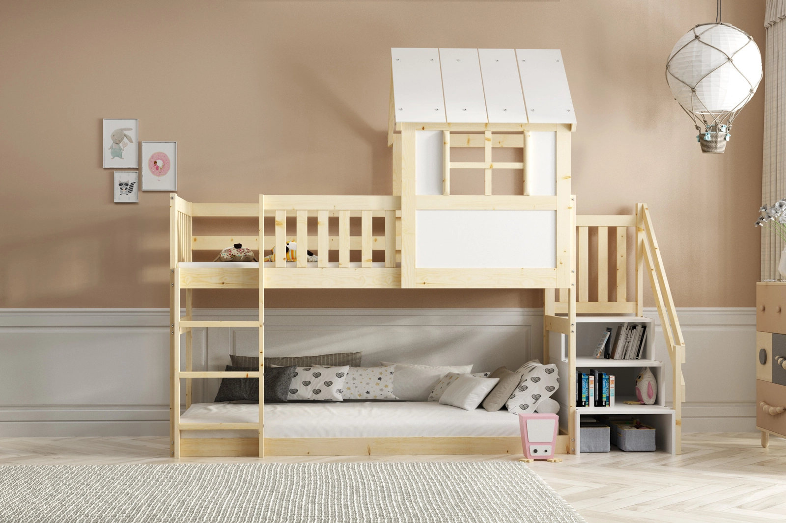 Unser Haus-Hochbett vereint auf harmonische Weise Ästhetik und Praktikabilität. Aus hochwertigem Holz gefertigt, bietet es nicht nur Langlebigkeit, sondern verleiht dem Kinderzimmer auch natürlichen Charme. Das naturbelassene Gestell harmoniert perfekt mit den weißen Fronten und schafft eine moderne, freundliche Atmosphäre.