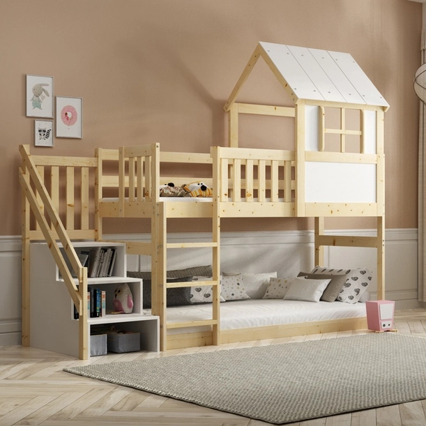 - Das Hochbett-Haus mit Treppe ist die ideale Lösung für das Kinderzimmer. Gefertigt aus Naturholz, verbindet es Funktionalität mit Ästhetik. Die Liegefläche von 90x200 cm und die weißen Fronten schaffen einen harmonischen Raum für Ihr Kind.