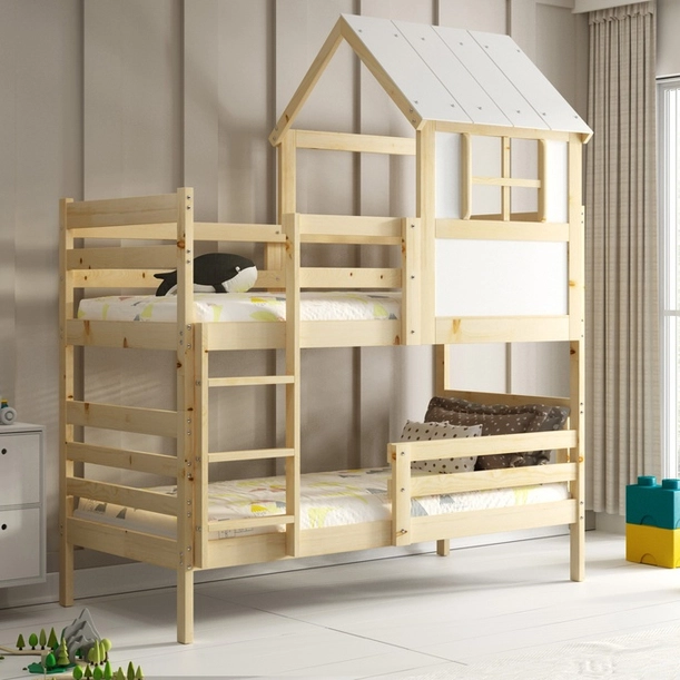 Das Hochbett mit Dach, mit einer Liegefläche von 90x190 cm, ist aus solidem Holz gefertigt und garantiert Langlebigkeit und Sicherheit. Die natürliche Farbe des Rahmens harmoniert mit den weißen Fronten und verleiht dem Bett ein elegantes, universelles Erscheinungsbild, das sich in fast jedes Raumkonzept einfügt. Eine ausgezeichnete Wahl für alle, die zeitloses Design und natürliche Materialien schätzen.