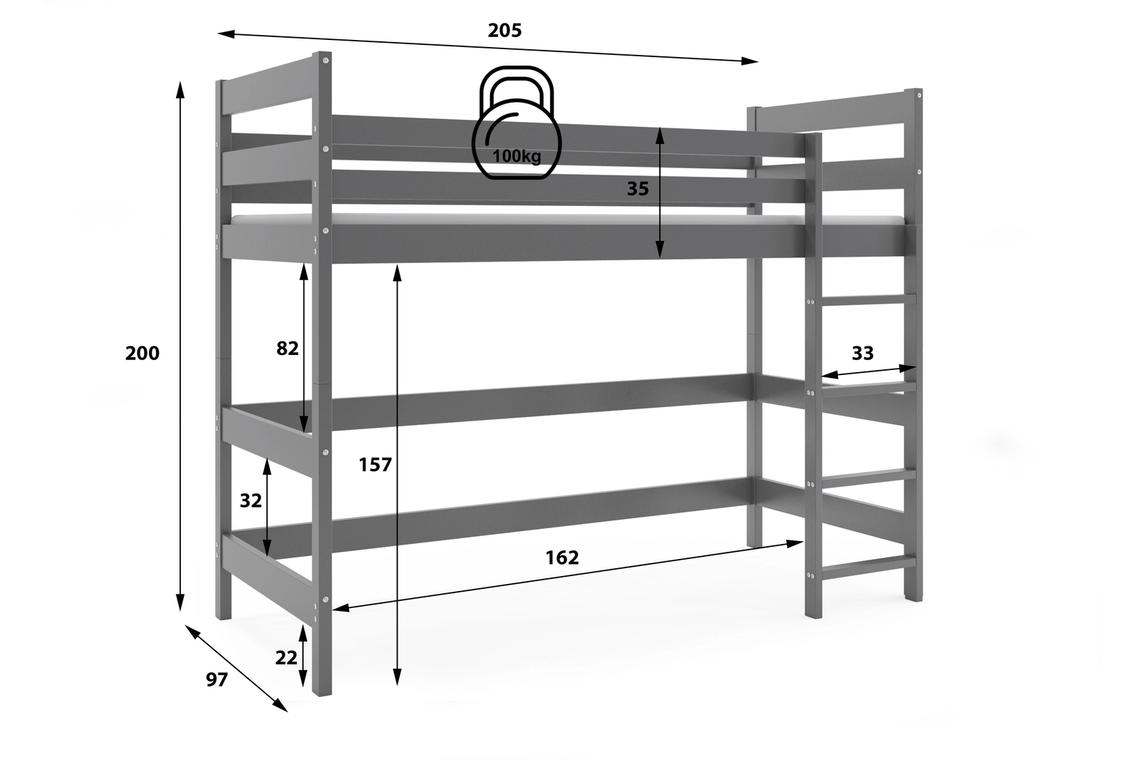Das Jugend-Hochbett bietet eine Liegefläche von 90x200 cm – ausreichend, um einem heranwachsenden Kind einen komfortablen Schlaf zu gewährleisten und den gängigen Anforderungen von Jugendlichen gerecht zu werden. Die Konstruktion aus hochwertigem Holz garantiert Langlebigkeit und Sicherheit. Das Holz verleiht dem Bett ein natürliches und warmes Erscheinungsbild und unterstützt einen ökologischen, umweltfreundlichen Ansatz bei der Einrichtung.