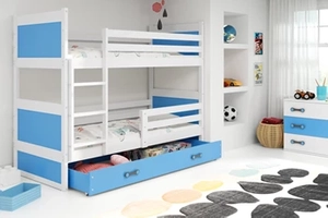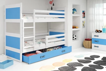 Stockbett für Jugendliche Richard, 90x200, mit Matratze und Schublade, weiß/blau