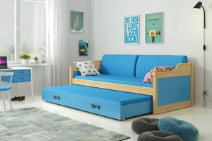 Ausziehbett für Jugendliche David, 90x200, mit Matratze und Schublade, Kiefer/blau