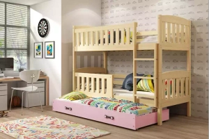 Etagenbett für drei Personen Jakob, 90x190, mit Matratze und Schublade, Kiefer/rosa