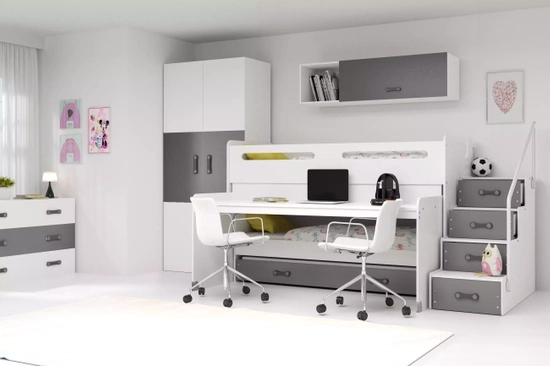 Hochbett für drei Personen Max 1, 80x200, mit Matratze und Schreibtisch, grau