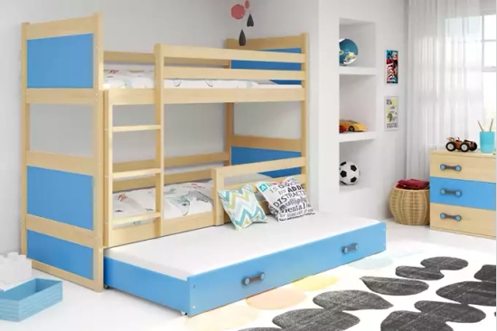 Etagenbett für drei Personen Richard, 90x190, mit Schublade, Kiefer/blau