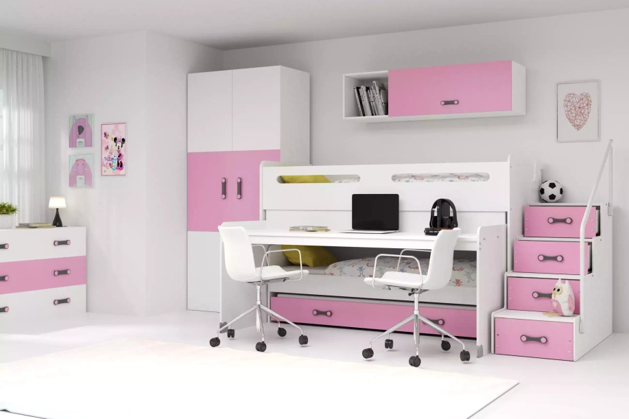 Für uns, wie auch für Sie, zählt vor allem die Sicherheit Ihrer Kinder, deshalb ist das Dreikinderbett MAX 1 aus hochwertigem MDF und Möbelplatten gefertigt. Wir haben alles mit starken, druckfesten Schrauben verbunden. Wir wissen, dass ein solches multifunktionales Möbelstück viel tragen muss, und ihm sollten die Spiele der Kinder nicht schrecklich sein. Umso mehr, als ihre Fantasie und Energie grenzenlos sind. Die flexiblen Lattenroste sorgen für die richtige Schlafposition und sorgen so für eine tiefe Ruhe und eine gesunde Wirbelsäule. Rosa ist für mehrere Jahre alte Prinzessinnen und romantische Teenager gemacht. Um diese Farbe zu erhalten, haben wir eine antiallergische Wasserfarbe verwendet, die die Oberflächen vor Verschmutzungen schützt und die Reinigung erleichtert. Es ist sicher auch für Kinder mit Hautreizungen.