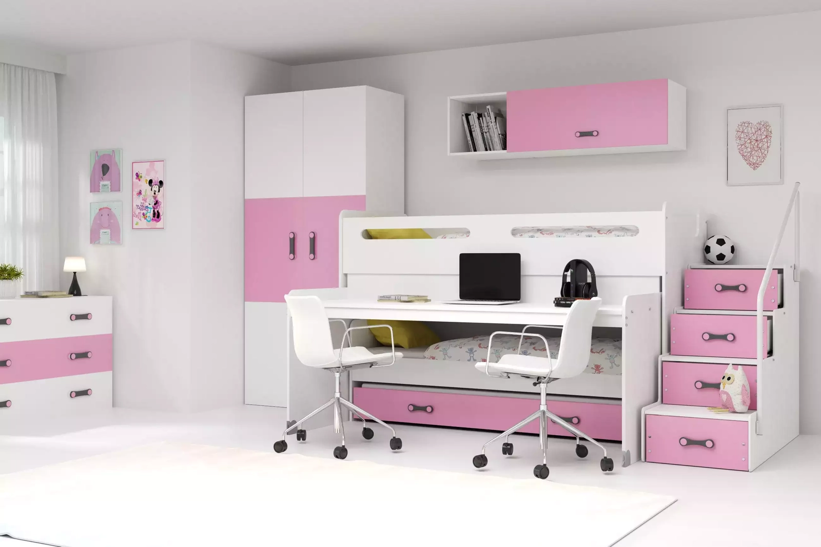 Hochbett für drei Personen Max 1, 80x200, mit Schreibtisch, rosa