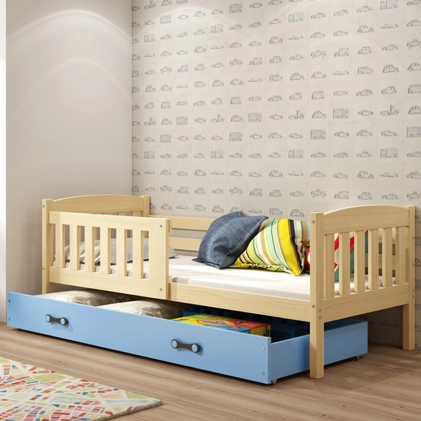 Jugendbett Jakob, 90x190, mit Matratze und Schublade, Kiefer/blau