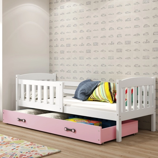 Das Einzelbett Jakob hat ein modernes Design und der abgerundete Rahmen verleiht ihm Leichtigkeit und ein geradezu weiches Aussehen. Die Größe 90x190 ist die perfekte Wahl für Sie, wenn Sie nach einer funktionalen Lösung suchen, die Ihnen jahrelang dienen wird. Es wird sowohl für ein paarjährige als auch für einen Teenager einen komfortablen Ort der Entspannung bieten. Die pinkfarbene Schublade im unteren Teil wird jedes Mädchen begeistern. Kann als Stauraum für Bettwäsche oder als zusätzlicher Stauraum für Spielzeug verwendet werden. Eine praktische Lösung, die vor allem Sie glücklich macht, wenn Sie Ordnung lieben. Die Designergriffe heben sich dezent ab. Wenn Sie sich für ein Einzelbett Jakob entscheiden, erhalten Sie alles, was am wichtigsten ist: Sie erhöhen die Sicherheit Ihres Kindes, erhöhen die Funktionalität des Zimmers und sichern sich einen ruhigen Schlaf.