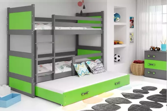 Etagenbett für drei Personen Richard, 90x190, mit Schublade, grau/grün