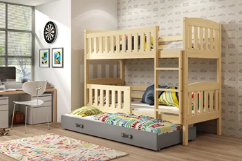 Etagenbett für drei Personen Jakob, 90x200, mit Matratze und Schublade, Kiefer/grau