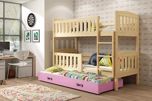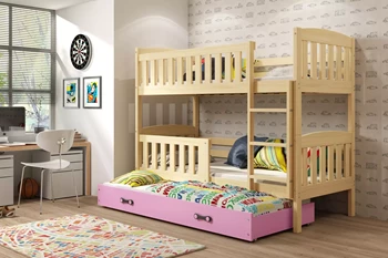Etagenbett für drei Personen Jakob, 90x190, mit Schublade, Kiefer/rosa