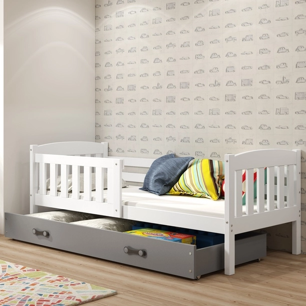 Kinderbett Jakob, 80x160, mit Matratze und Schublade, weiß/grau