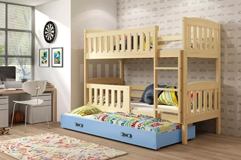 Etagenbett für drei Personen Jakob, 90x200, mit Schublade, Kiefer/blau