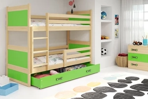Etagenbett für drei Personen Richard, 90x190, mit Matratze und Schublade, Kiefer/grün