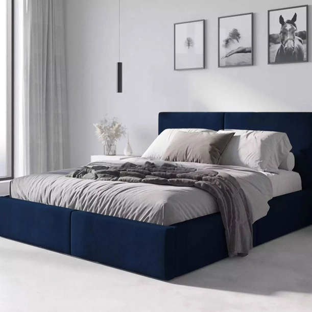 Durchdachte Konstruktion und präzise Details ermöglichen eine schnelle und unkomplizierte Montage. Nach dem Aufbau präsentiert sich das Bett besonders modern und ordentlich. Die glatten Elemente aus laminierten Platten sind pflegeleicht im Alltag, während der blaue Stoffbezug die Linienführung betont und das Bett zum attraktiven Mittelpunkt des Schlafzimmers macht. Dank seiner universellen Form fügt es sich harmonisch in moderne, skandinavische und klassische Einrichtungen ein.