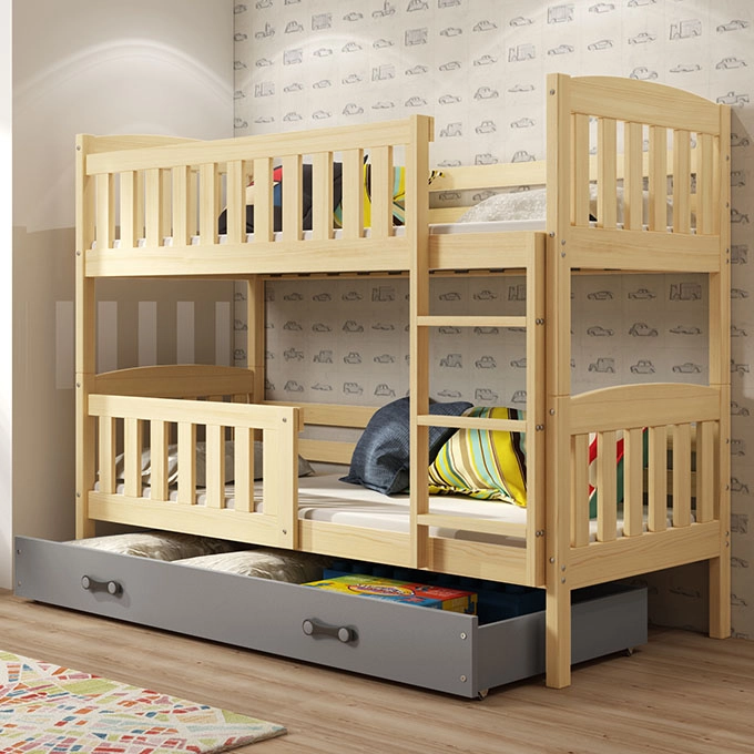 Durch das stapelbare Design wird der Raum optimal genutzt, so dass mehr Platz zum Spielen oder Lernen bleibt. Die Konstruktion aus Kiefernholz und mit hochwertigen Stahlschrauben verstärkt, ist stabil und robust. Dies wiederum bedeutet Sicherheit für Ihre Kinder während des Schlafes und einen erholsamen Urlaub. Die Möglichkeit, Geländer auf beiden Ebenen zu montieren, ist eine Verneigung gegenüber den Jüngsten und das Ergebnis der Sorge um sie. Sie schützen selbst die bewegungsfreudigsten und energischsten Kinder vor dem Sturz. Das Gestell aus federnden Brettern bietet eine hervorragende Unterstützung für die Wirbelsäule. Die Größe von 90x190 cm macht es zu einer Investition für Jahre. Perfekt für einen 3-Jährigen und einen Teenager. Naturholz wird jeden Raum erwärmen. Das Bett verfügt über eine multifunktionale Schublade auf Rollen, die ein großartiger Platz für Bettwäsche, Spielzeug oder zusätzliches Bücherfach ist. Die perfekte Lösung, um den Raum zu organisieren und die Ordnung aufrechtzuerhalten, nach der Sie sich am meisten sehnen. Die graphitfarbene Schublade ist eine interessante Geste. Macht das Bett zum Hauptelement der Anordnung. Das abgerundete Design wirkt leichter, so dass es den Innenraum trotz seiner Größe nicht überfordert.