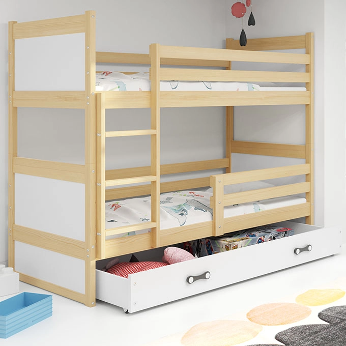 Wir wissen, dass es Ihr Ziel ist, Ihren Kindern Sicherheit und Komfort zu bieten. Sie möchten, dass sie zu Hause ihren eigenen Platz haben. Wir sind uns auch bewusst, dass es nicht einfach ist, ein gemeinsames Zimmer für zwei Kinder einzurichten, insbesondere wenn der Altersunterschied groß ist. Wenn Sie vor einer solchen Herausforderung stehen, haben wir genau das Richtige für Sie: das Etagenbett RICO. Die Holzkonstruktion ist stabil und die hochfesten Schrauben sorgen für zusätzliche Verstärkung. Die am unteren und oberen Bett angebrachten Geländer schützen die Kleinen zusätzlich vor Stürzen, selbst wenn sie nachts noch voller Energie sind. Sie können sowohl auf der rechten als auch auf der linken Seite montiert werden, die Entscheidung liegt bei Ihnen. Der Rahmen aus flexiblen Latten fördert eine korrekte Körperhaltung, was sich in Zukunft in einer gesunden und starken Wirbelsäule auszahlt, für die Ihre Kinder Ihnen dankbar sein werden. Naturholz verleiht jedem Raum Wärme und bietet eine Vielzahl von Gestaltungsmöglichkeiten.Die Bettgröße 90x200 ist eine äußerst komfortable Lösung. Sie bietet viel Platz zum Schlafen. Das ist besonders dann von unschätzbarem Wert, wenn der Altersunterschied zwischen Ihren Schätzen groß ist. Außerdem ist es eine Investition für viele Jahre – sowohl für 5-Jährige als auch für Teenager bequem.